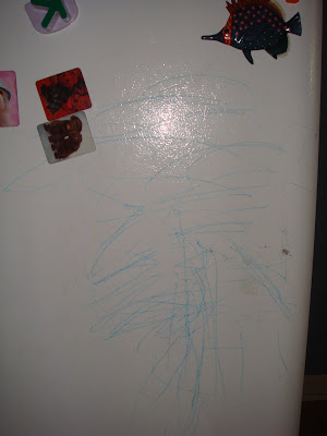 Sadie's art work on the fridge!! Her saying Cheez beside it...; )